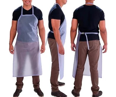 Avental em vinil, com alças e tiras para suspensão no pescoço e ajuste na cintura, soldadas eletrônicamente, ou com fivelas de ajuste.