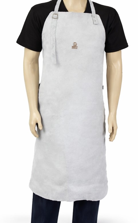 Avental de segurança confeccionado em raspa, tiras no pescoço e na cintura em raspa, presas por fivelas metálicas para ajustes.