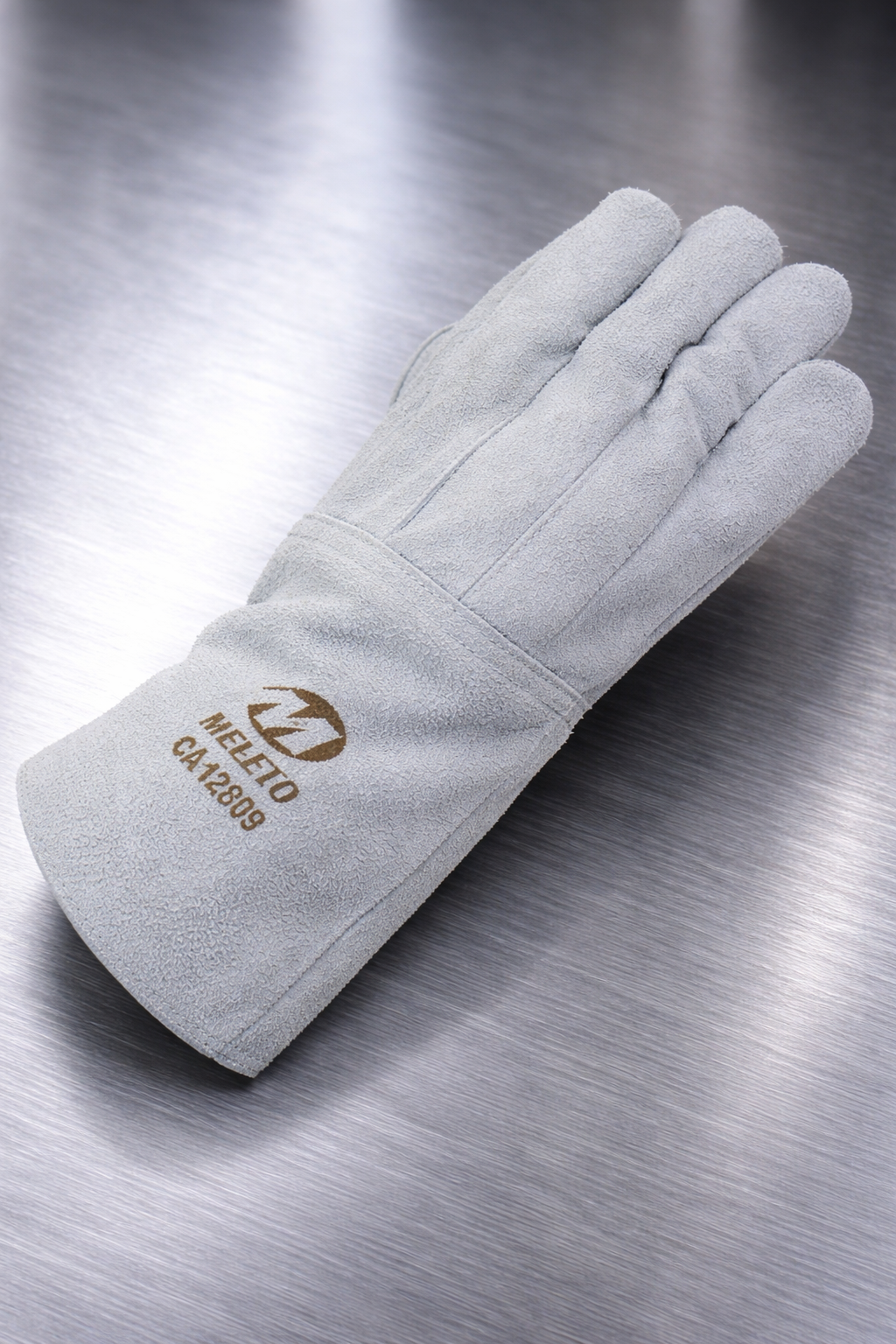 Luva de segurança com punho de 20 cm utilizada para proteção das mãos contra agentes abrasivos, escoriantes, cortantes e perfurantes. Confeccionada em raspa, possui reforço externo em raspa entre o polegar e o indicador e reforço interno em raspa, na palma e dedos.